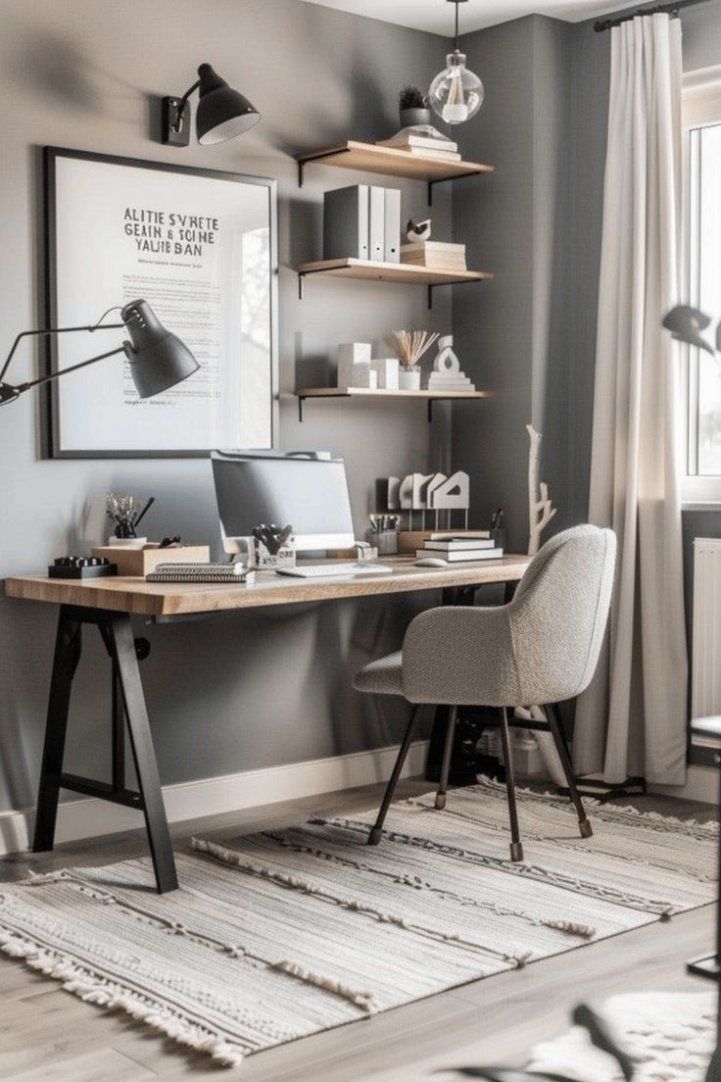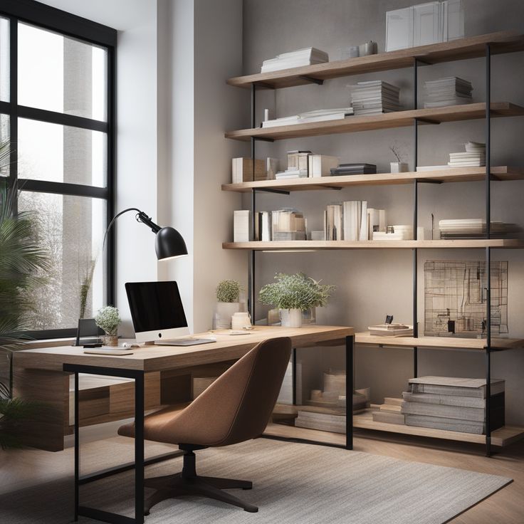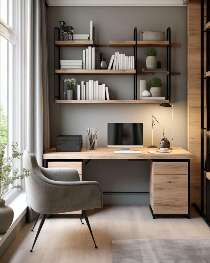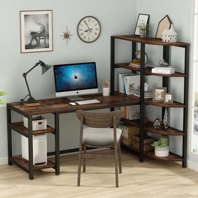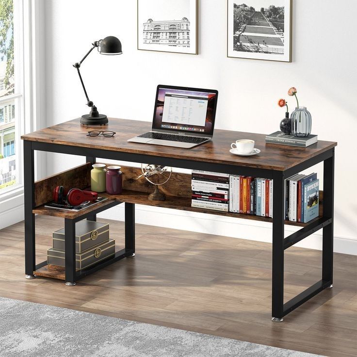 Thiết kế kết hợp thêm học tủ và kệ tạo thêm không gian lưu trữ và làm việc hợp lý, dạng bàn này thiết kế đơn giản với bộ khung từ sắt và kim loại. Gỗ được kết hợp với khung gỗ tạo cảm giác vững chắc.