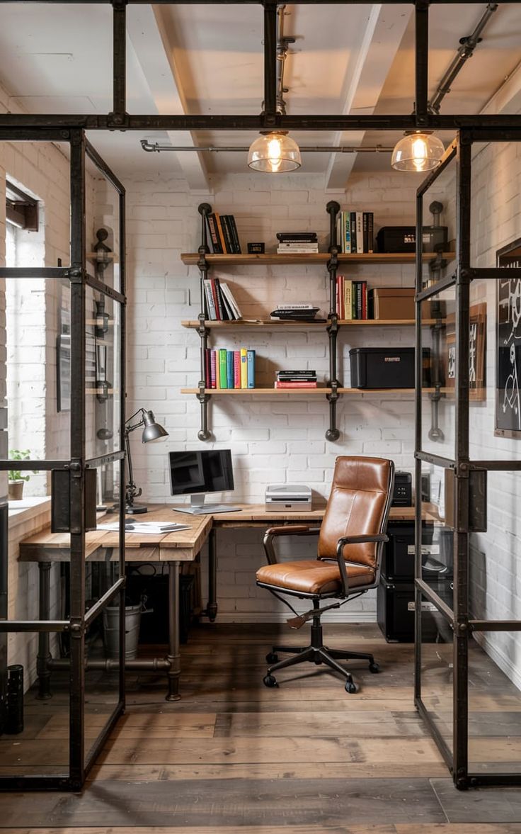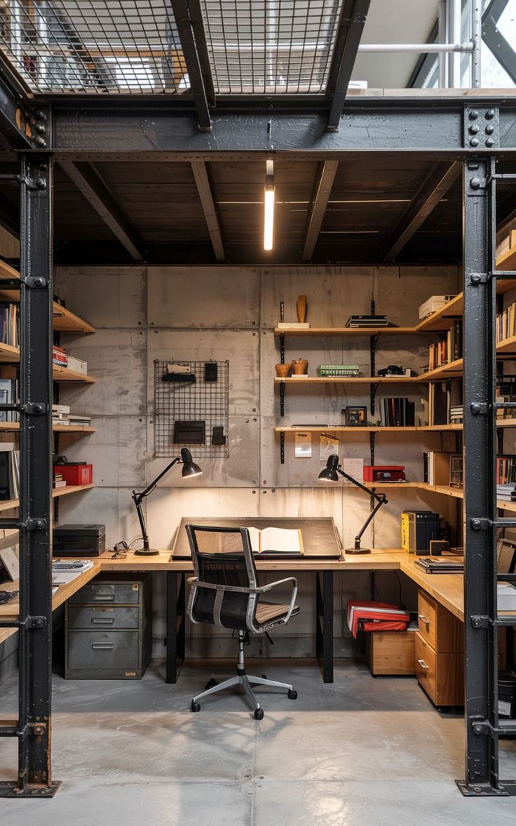 Bàn làm việc chân sắt kết hợp học tủ và kệ.