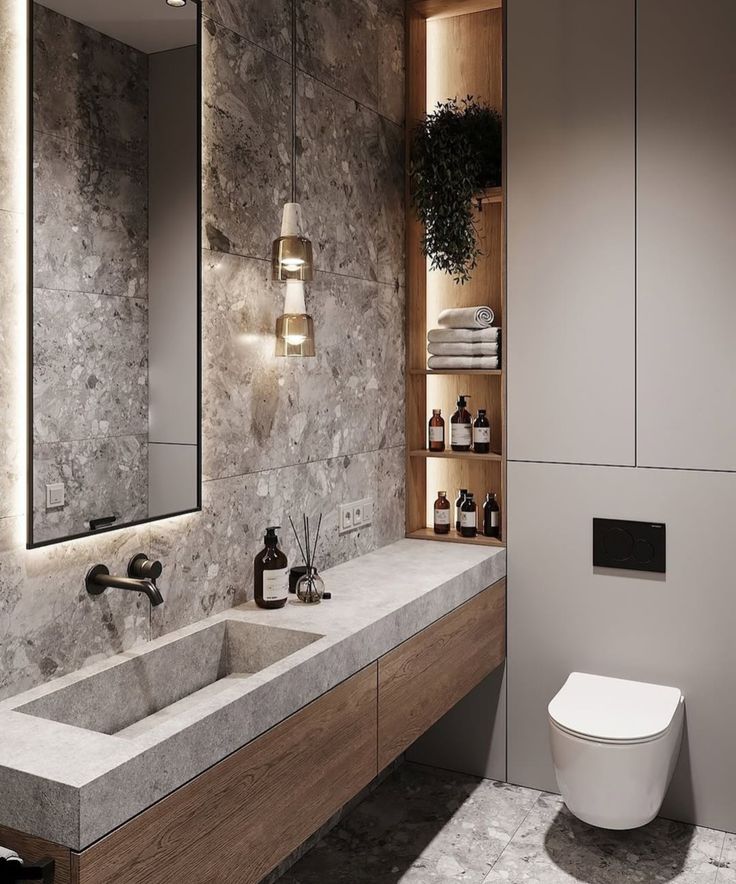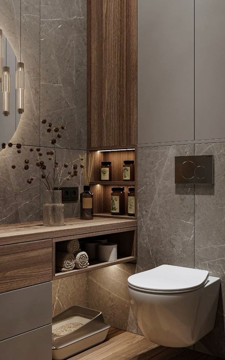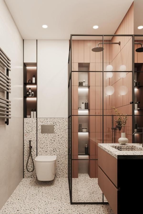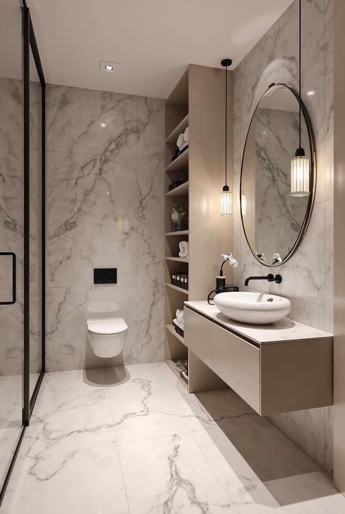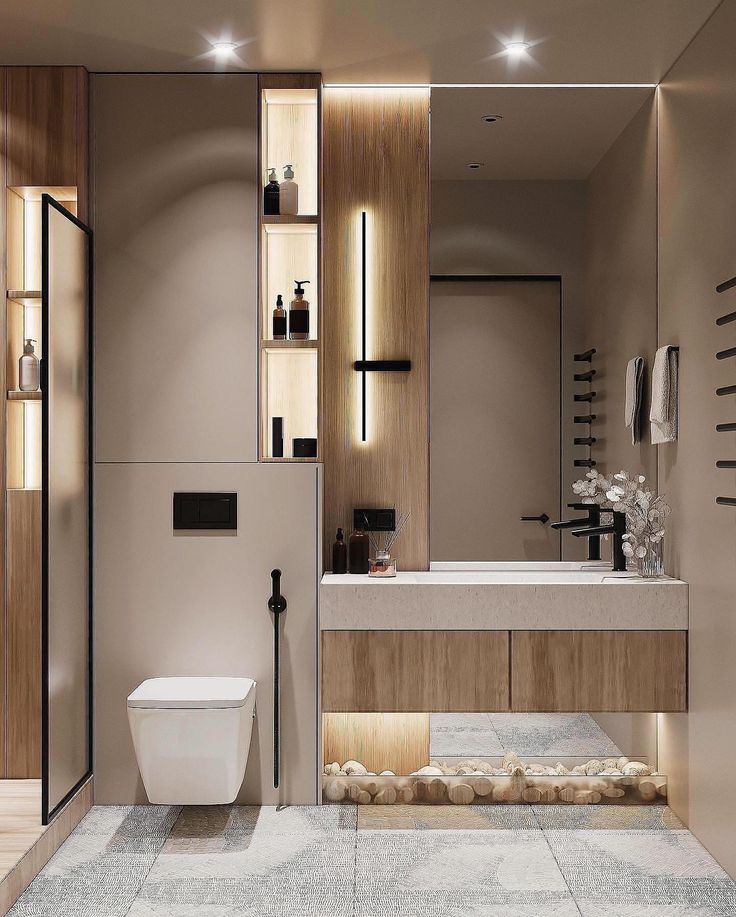 Một phong cách thường thấy cho những nhà tắm sang trọng và đẳng cấp, đây vẫn là một trong những lựa chọn tuyệt vời để tân trang cho không gian phòng tắm bạn trở nên nổi bật hơn.
