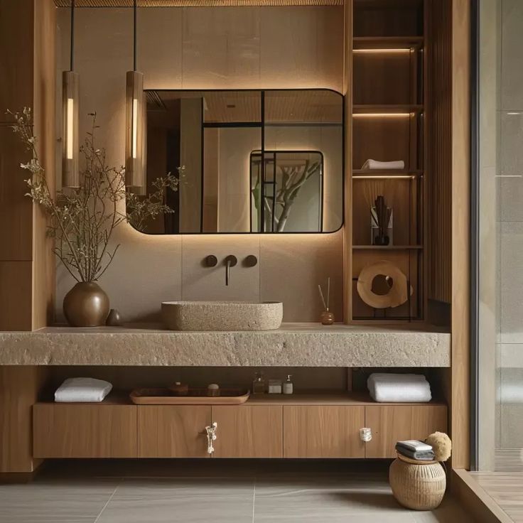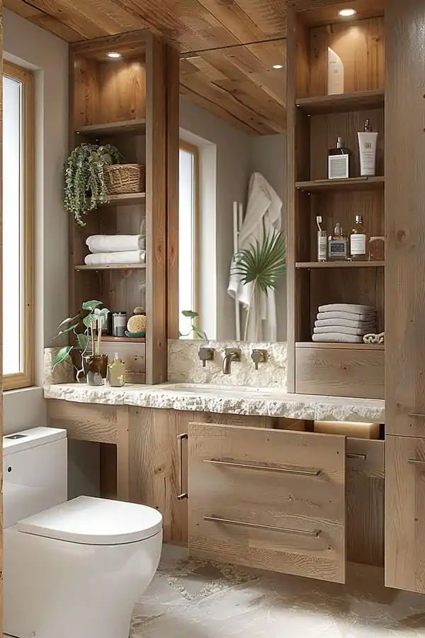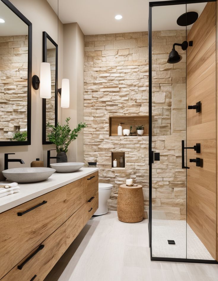 - Chất liệu gỗ công nghiệp kết hợp các bề mặt đá, gạch,….